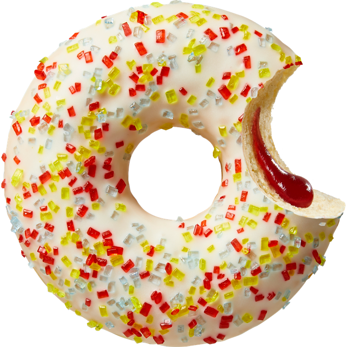 Zet je tanden in deze donut met wit glazuur en heerlijke frambozenvulling! Een donut met frambozenvulling, bedekt met suikerzoete, fonkelende ijskristallen.